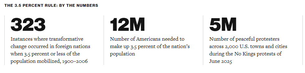 History shows that when just 3.5 percent of a population—about 12 million Americans—engage in peaceful protest, their demands become nearly impossible to ignore. This is particularly relevant today, as Americans continue to defend due process and health care rights amid a rise in authoritarian policies.