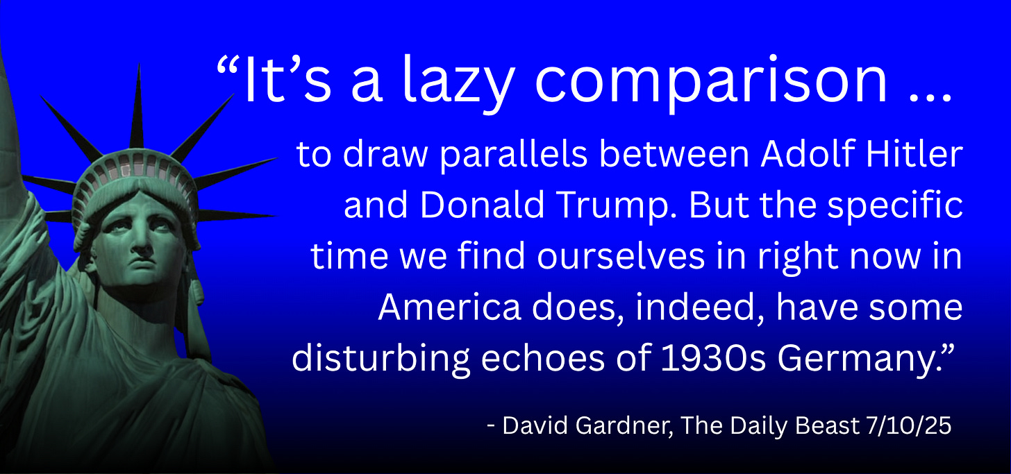 In David Gardner’s article published in the Daily Beast on July 10th, “The Echoes of Hitler that Make Trump the world’s Most Dangerous Man,” Gardner says, “It’s a lazy comparison to draw parallels between Adolf Hitler and Donald Trump. But the specific time we find ourselves in right now in America does, indeed, have some disturbing echoes of 1930s Germany.”