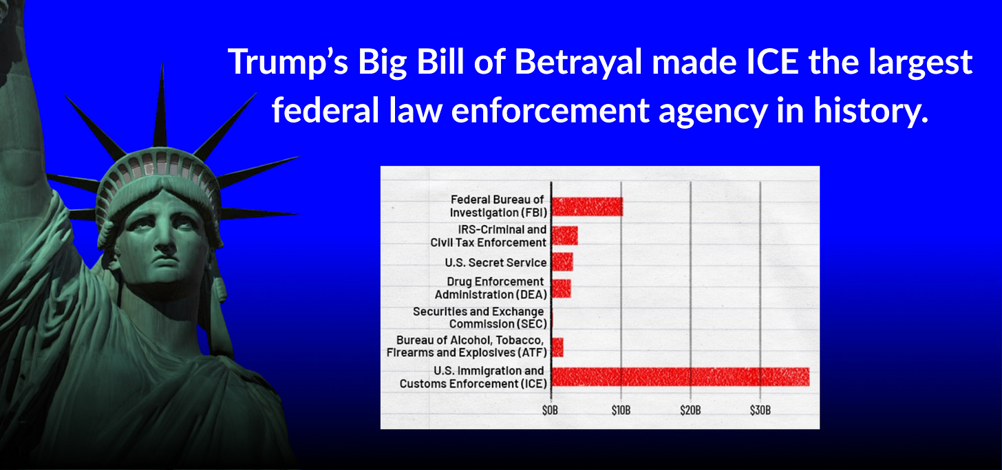 In it, he says of all the yucky-ucky no good things hidden in Trump’s Big Bill of Betrayal, the one that we would see the soonest is ICE’s giant leap of funding. The BBB ballooned ICS’s annual budget to $37.5 billion, thereby making it the largest federal law enforcement agency in the history of our republic.