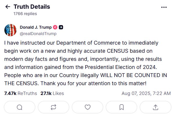 The line about excluding illegal immigrants could just be red meat he’s throwing to his MAGA allegient. Note that the potential impacts for reduced funding due to lower census counts would cut across both Red and Blue states (i.e., Florida and Texas have 2 of the highest immigrant populations in the country, second only to California). Yours truely is skeptical that this is his primary goal.