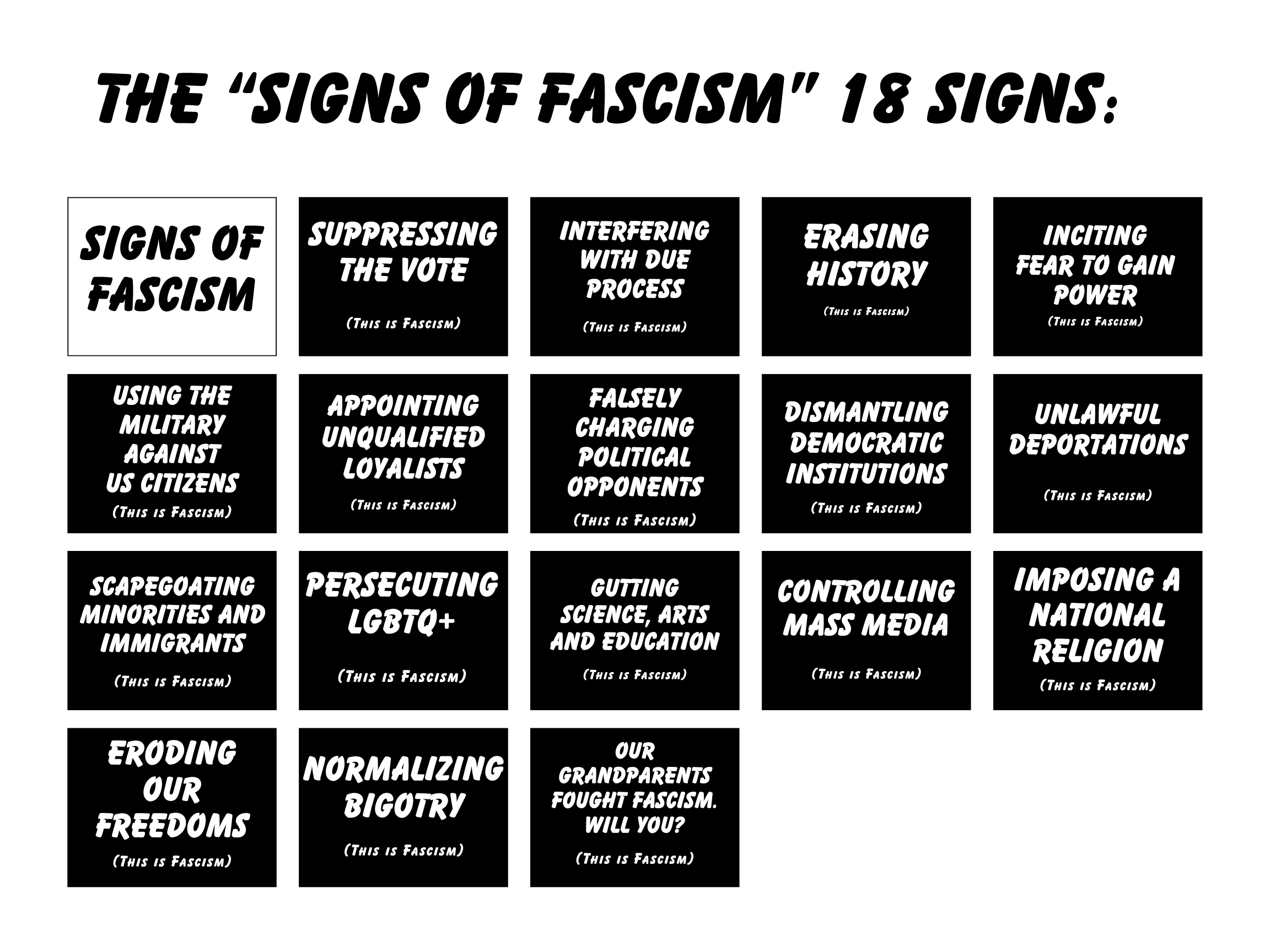 Signs of Fascism - 18 signs to hold at standouts and protests, Burma-Shave style!