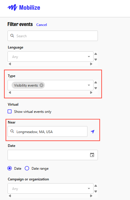 To use MOBILIZE, click on this LINK, then click on the FILTERS button and enter Type = Visibility events, then Near = Your Town.
